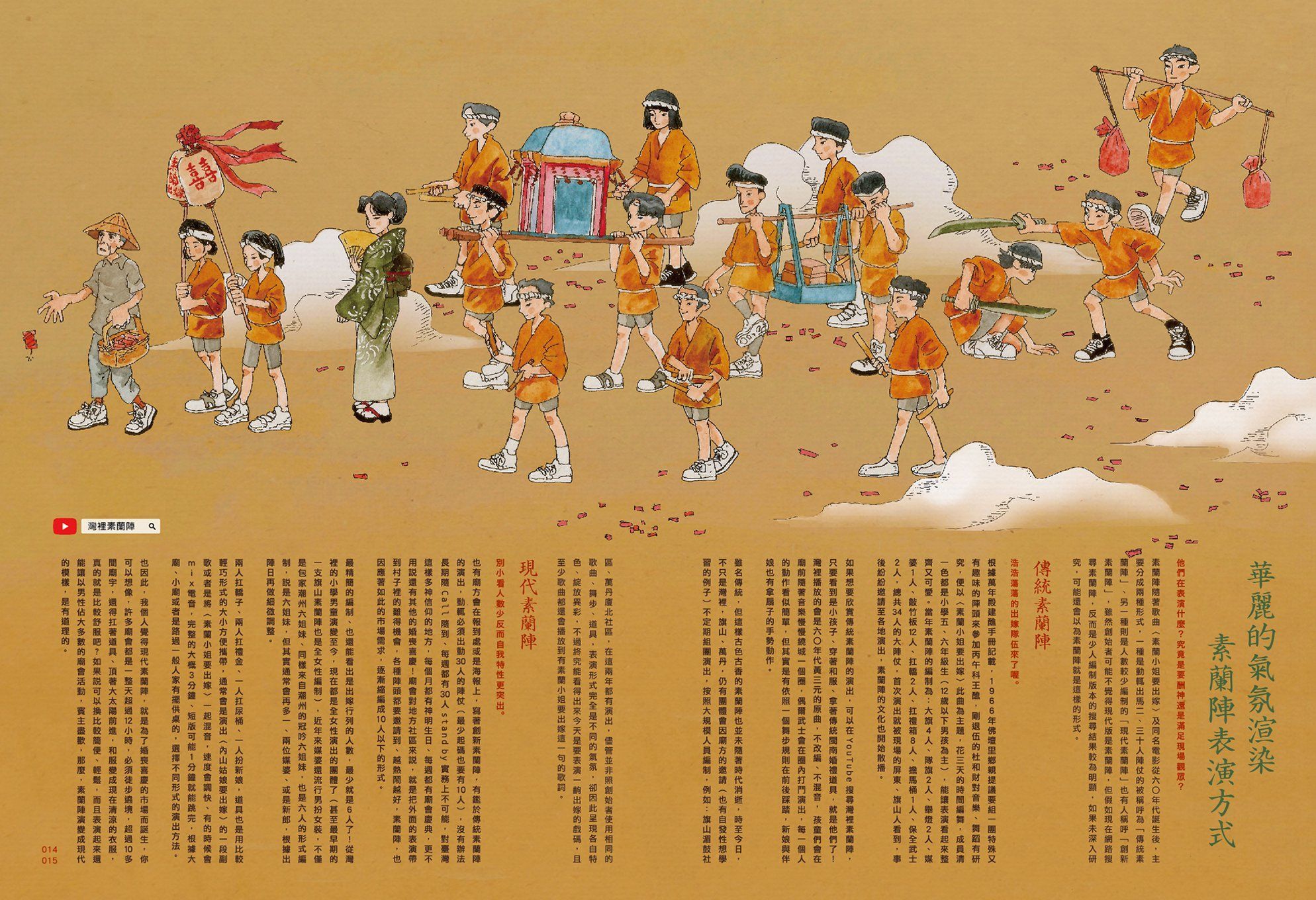 時代在變,台灣廟會陣頭也跟著時間一同邁進,我們曾在2009高雄世運見證過電音三太子站上國際舞臺,不過,民間的力量從未間斷,《to̍k》要和讀者分享,我們在廟會中,時常遇見的表演團體,就得來認識版面相對較小的——素蘭陣,源自七〇年代的 MIT 陣頭,結合北海道歌謠、日本服飾、台語歌曲、閩南婚禮習俗,演變至今融合 Techno 電音的陣頭,如果還不認識「她」們,請趕緊點開 YouTube 影片欣賞陣頭的賣力演出。